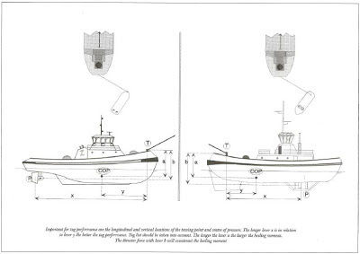 Um trecho do “Tug Use in Port” diz que: …the larger lever x is compared to lever y, the less sideways thrust is needed to balance hydrodynamic forces at the centre of pressure and the higher the towline forces will be.” pg.143.